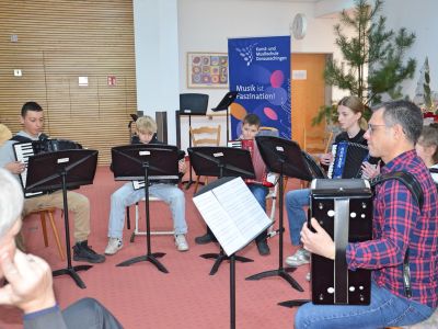 Im weihnachtlich geschmückten Foyer präsentierten sich Solisten und Ensembles der Musikschule. Die Veeh-Harfen-Gruppe des Altenheims unter der Leitung von Peter Stelzl eröffnete den musikalischen Reigen mit drei Adventsliedern, verstärkt von jungen Musikschülern mit Gitarre, Blockflöte und Cello. Aus den verschiedenen Instrumentalklassen präsentierten sich zunächst Solisten oder Duos mit Musik aus aller Welt. Dazwischen gab es immer wieder bekannte Weihnachtslieder zu hören, bei denen fleißig mitgesummt oder mitgesungen wurde. Besonders beeindruckend waren die Ensembles gegen Ende der Matinee. So überzeugte das Gitarrenensemble unter der Leitung von Hans Peter Wößner mit "What Child is this?" und "Fröhliche Weihnacht überall" durch seinen schönen Klang, während das Akkordeonensemble unter der Leitung von Kai Armbruster das "Christmas Lullaby" von John Rutter sehr musikalisch und spannungsvoll vortrug. Mit zwei internationalen Liedern des Danube Folk Ensembles unter der Leitung von Michael Wild fand die Adventmatinee einen stimmungsvollen Ausklang.