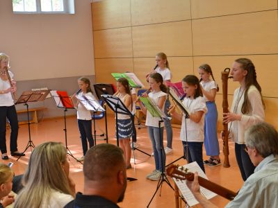 Die Lehrerinnen und Lehrer bereiteten mit ihren Schülerinnen und Schülern sowie verschiedenen Ensembles ein abwechslungsreiches, fein ausgewähltes Konzert vor. Das Blockflötenensemble unter Leitung von Frau Susanne Weber eröffnete stimmungsvoll das Konzert mit dem „Aufzug“ und „Reigen“ aus Henry Purcell´s Sommernachtstraum, während im Anschluss das „Green Brass Ensemble“ Valentin Rathgebers Sonata klangvoll von der Empore darbot. Von F. K. Graf zu Erbach, einem Zeitgenossen Telemanns, brachten Felicitas Hüther und Sarah de Surmont auf ihrer Querflöte ein selten aufgeführtes Menuett sehr überzeugend zu Gehör.