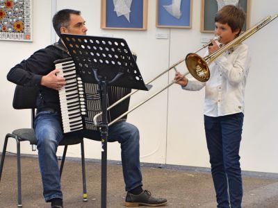 Schwungvoll und „jazzig“ angehaucht präsentierte der junge Posaunist Jakob Armbruster „Mr. John“, begleitet auf dem Akkordeon von Herrn Kai Armbruster.