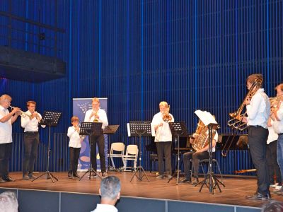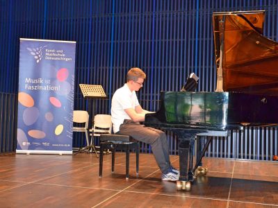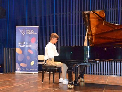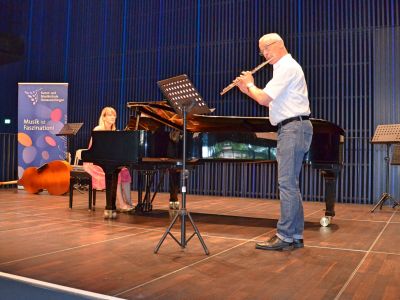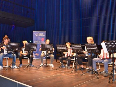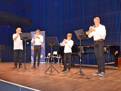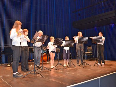 Verschiedene Ensembles wie z. B. Trompetenquartett, großes Blechbläserensemble, Flötenensemble und Akkordeonensemble glänzten mit ihren Vorträgen und wurden von ihren Lehrern Peter Stelzl, Leopold Reisenauer, Kai Armbruster und Manfred Maier bestens vorbereitet. Mit dem Präludium für zwei Violinen und Klavier gelang es Markus, Arthur und Liliya Blenkle, eine ganz besondere melancholische Atmosphäre in den Saal zu zaubern.