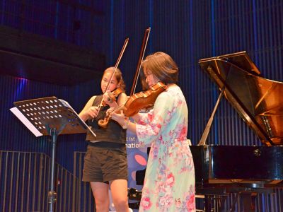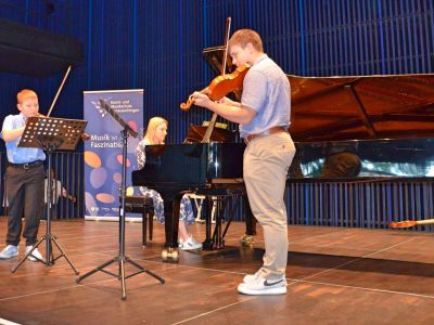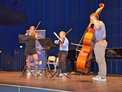 Besondere klangliche Akzente setzte Laura-Marie Schröder gemeinsam mit ihrer Lehrerin Hanlin Liang mit „Dancing with the Rabbi“ ebenso wie das Streichertrio „crazy“ in der Besetzung Laura-Marie Schröder, Arthur Blenkle (Violinen), Markus Blenkle (Kontrabaß). Das Trio überzeugte mit dem Stück „The crazy bride“ im Klezmerstil, mit voller Spielfreude und setzte einen fulminanten Schlußpunkt.