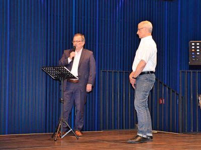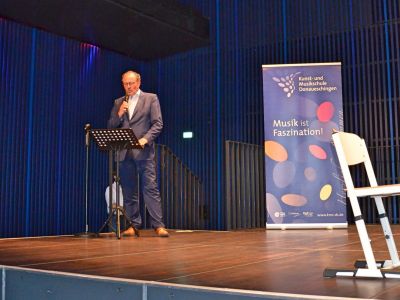 Im Rahmen des Schlusskonzerts wurde Manfred Maier, Lehrer für Querflöte nach 40 Jahren Lehrtätigkeit an der Musikschule Donaueschingen von Schulleiter Clemens Berger mit einem Foto vom derzeitigen Lehrerkollegium, Weinpräsent und Geschenkgutschein feierlich in den verdienten Ruhestand verabschiedet.