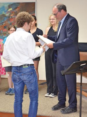 BM Severin Graf überreichte den Teilnehmern von „Jugend musiziert“ beim Empfang in der Musikschule ihre Urkunden vom Regionalwettbewerb. Insgesamt nahmen 10 Schülerinnen und Schüler der Musikschule Donaueschingen am Wettbewerb teil. Am Regionalwettbewerb erhielten zwei Jugendliche einen zweiten Preis, fünf einen 1. Preis sowie drei Teilnehmer einen 1. Preis mit Weiterleitung zum Landeswettbewerb. Auf Landesebene in Künzelsau konnten die Schülerinnen und Schüler aus Donaueschingen zwei 2. Preise sowie einen 1. Preis mit Weiterleitung zum Bundeswettbewerb erzielen. Antonius Hall erspielte sich beim Bundeswettbewerb in Zwickau einen 3. Preis. Mit der Feierstunde wolle man die Leistungen der Schülerinnen und Schüler würdigen und in einem schönen Rahmen auszeichnen, so Musikschulleiter Clemens Berger. BM Severin Graf hob den Stellenwert der Musikschule der Stadt Donaueschingen hervor und betonte, dass nicht der Preis alleine ausschlaggebend sei, sondern der Weg an sich. Es sei auch wichtig, den richtigen Grad zwischen Herausforderung und Überforderung zu treffen, wobei ein solcher Wettbewerb auch eine gute Schule für das spätere Leben darstellt und positive Begleiterscheinungen mit sich bringe. Die Stadt Donaueschingen freut sich sehr über die Erfolge der Teilnehmer und BM Graf gratulierte den Schülerinnen und Schülern und würdigte das Engagement von Schülern und ihren jeweiligen Lehrern.