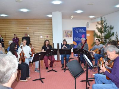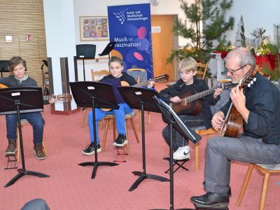 Im weihnachtlich geschmückten Foyer präsentierten sich Solisten und Ensembles der Musikschule. Die Veeh-Harfen-Gruppe des Altenheims unter der Leitung von Peter Stelzl eröffnete den musikalischen Reigen mit drei Adventsliedern, verstärkt von jungen Musikschülern mit Gitarre, Blockflöte und Cello. Aus den verschiedenen Instrumentalklassen präsentierten sich zunächst Solisten oder Duos mit Musik aus aller Welt. Dazwischen gab es immer wieder bekannte Weihnachtslieder zu hören, bei denen fleißig mitgesummt oder mitgesungen wurde. Besonders beeindruckend waren die Ensembles gegen Ende der Matinee. So überzeugte das Gitarrenensemble unter der Leitung von Hans Peter Wößner mit "What Child is this?" und "Fröhliche Weihnacht überall" durch seinen schönen Klang, während das Akkordeonensemble unter der Leitung von Kai Armbruster das "Christmas Lullaby" von John Rutter sehr musikalisch und spannungsvoll vortrug. Mit zwei internationalen Liedern des Danube Folk Ensembles unter der Leitung von Michael Wild fand die Adventmatinee einen stimmungsvollen Ausklang.
